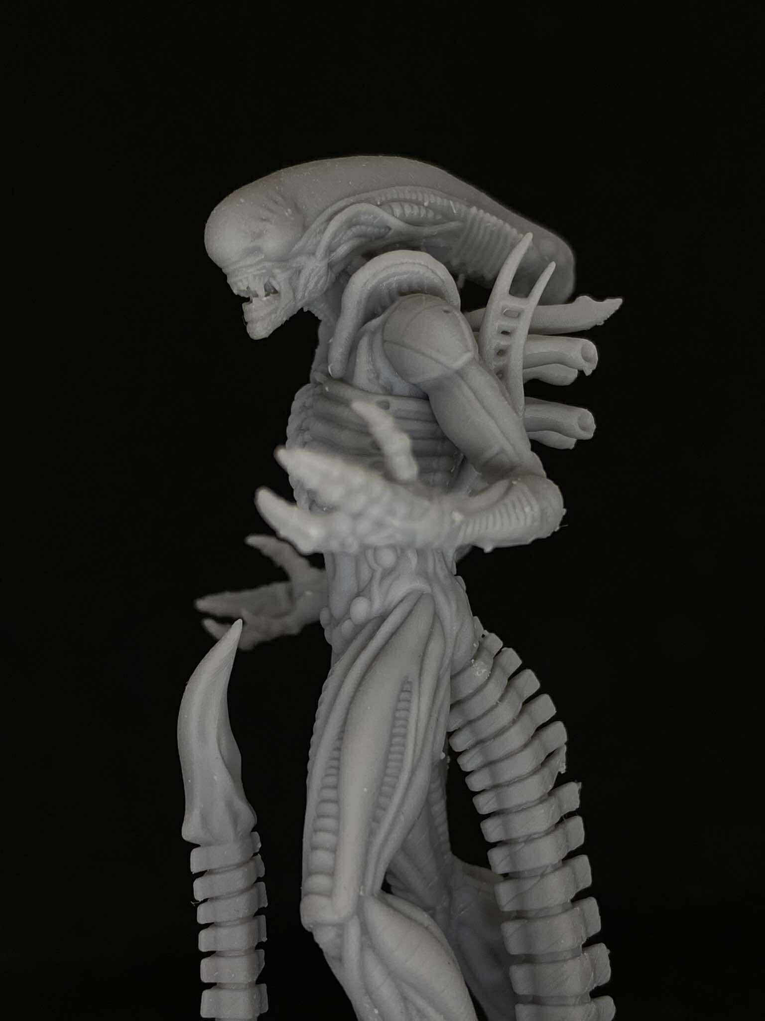 - Highly detailed alien monster standing tall with extended limbs, spinal tail, and iconic elongated dome head